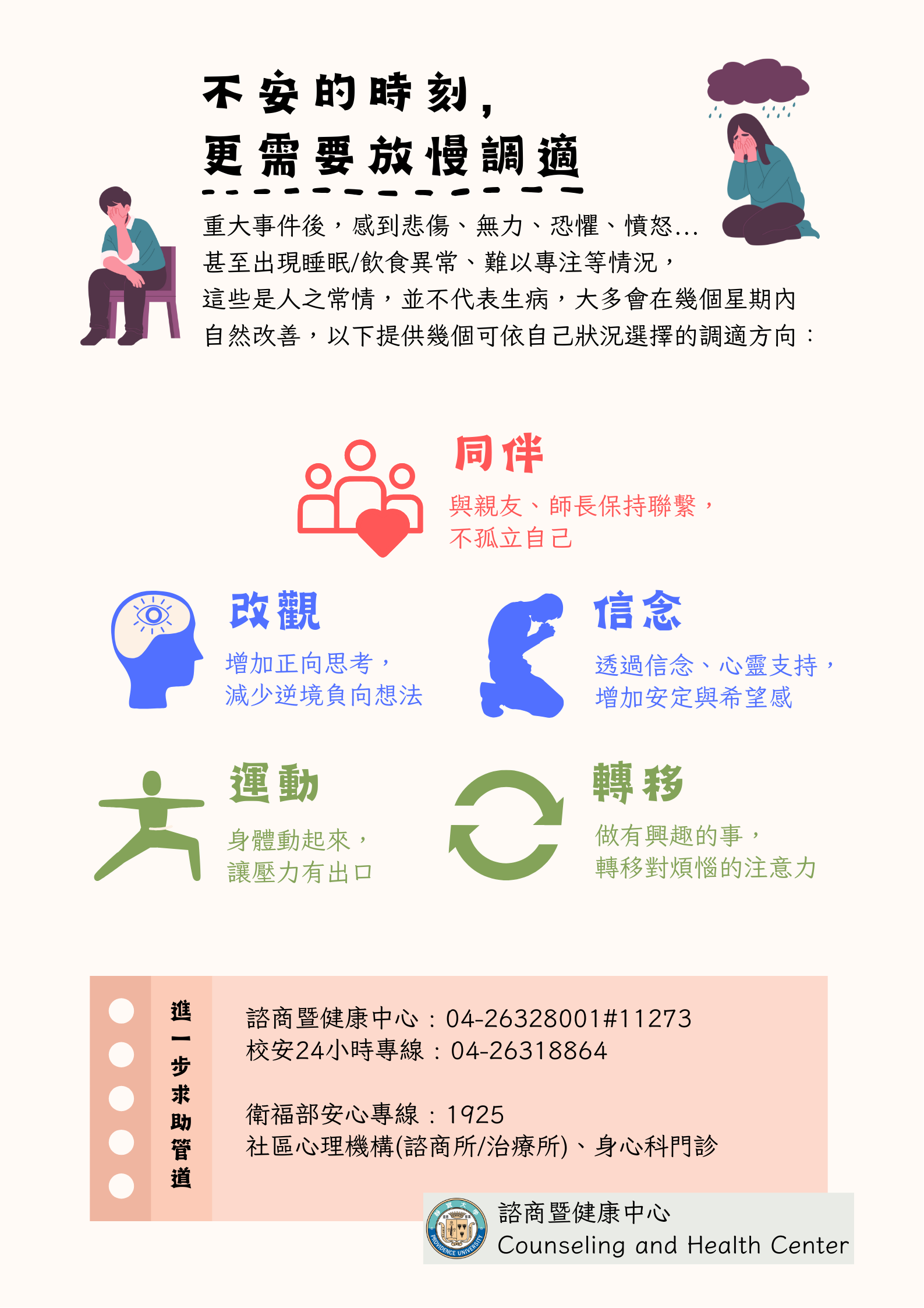 諮商暨健康中心隨時願意提供協助,共同度過這段不安的時刻。
