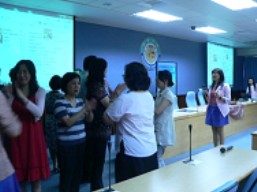 音樂滋養了心,食物滋養了肉體,只要天天唱歌就會覺得很開心,人唯獨在放鬆時常會唱歌,從音樂和遊戲當中,體會當下的感受,講師把老師分成兩個大圓圈,教大家跳一種擊掌舞,是讓自己能靜下心來專心跳舞跟著音樂和節奏,剛一開始有些人手忙腳亂、同手同腳,一而再三的練習,到後來時大家就都跟上音樂的節奏,生命就是要把握當下,體驗當中的樂趣,就算錯了也沒關係。